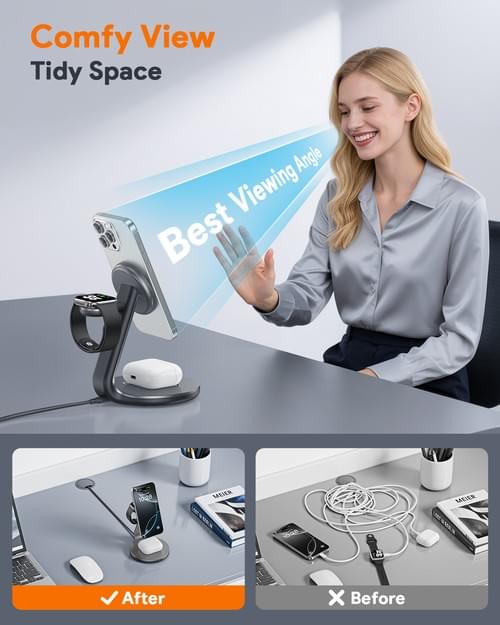 All-in-One Charging Solution: 3 in 1 Charging Station designed for MagSafe,powerful magnetic suction increases charging speed by 25%.The 3 in 1 wireless charging station conveniently powers up for iPhone, for iWatch, and for AirPods simultaneously, keeping all your devices ready to go in one sleek, organized spot.