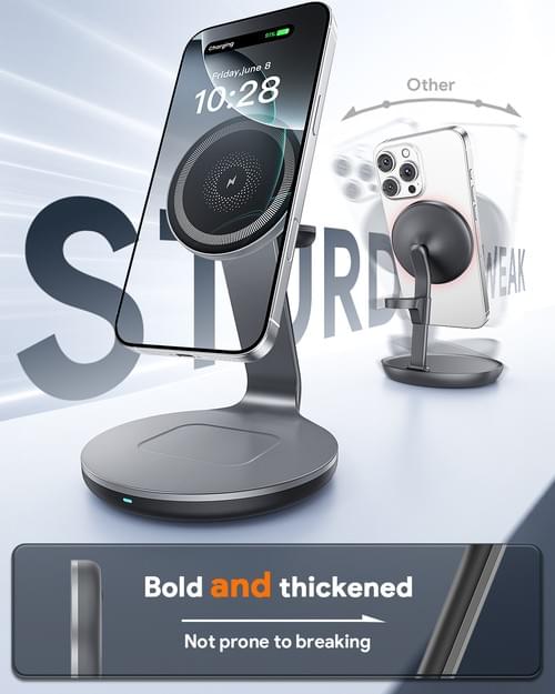 Compact & Stylish Design: This charging station features a minimalist, space-saving design. Its thick, sturdy base with a silicone anti-skid pad enhances its sturdiness and stability, allowing it to seamlessly blend into any home or office environment. Its sleek design looks stunning on a desk, nightstand, or bedside table.